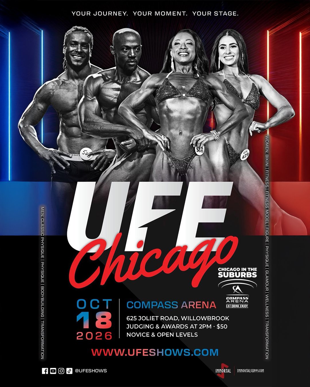 Compass Arena will host UFE Chicago on October 18, 2026, bringing a full day of competitive fitness and physique action to the Chicago suburbs.